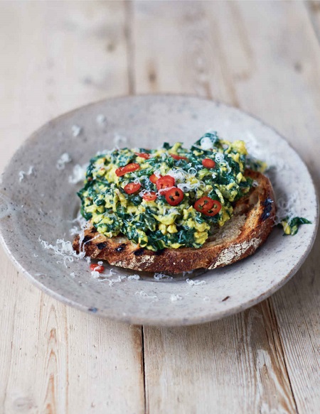 1 برش کوچک نان کامل سبوس دار را در تستر بگذارید. یک عدد تابه کوچک نچسب را بر روی حرارت متوسط گذاشته و یک کاغذ روغنی روی آن بکشید. 1 مشت برگ اسفناج را خرد کرده و در داخل تابه ریخته تا آبش گرفته شود، و همزمان 2 عدد تخم مرغ بزرگ را به همراه کمی نمک دریا و فلفل سیاه هم بزنید. تخم مرغ ها را در تابه ریخته، 5 گرم پنیر پارمزان را در آن رنده کرده، و هر 10 ثانیه با یک کاردک لاستیکی هم بزنید تا تخم مرغ کاملا پخته شده و بافت ایده آل را به خود بگیرد. به همراه تست، و با مقداری فلفل قرمز تازه خرد شده سرو کنید.