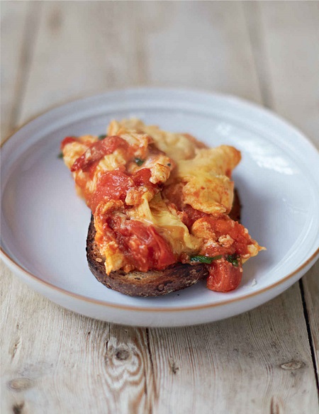 1 برش کوچک نان چاودار را در تستر بگذارید. یک عدد تابه کوچک نچسب را بر روی حرارت متوسط گذاشته و یک کاغذ روغنی روی آن بکشید. 2 عدد گوجه فرنگی رسیده را خرد کرده، سپس به همراه 1 پینچ نمک دریا و فلفل سیاه در تابه ریخته و به مدت 5 دقیقه بپزید. 2 عدد تخم مرغ بزرگ را در یک کاسه هم زده و 8 عدد برگ ریحان تازه در آن بریزید. سس گوجه غلیظ درست شده را کنار زده و یک برش 5 گرمی پنیر در آن ذوب کنید. ترکیب تخم مرغ را داخل تابه ریخته، و هر 10 ثانیه با یک کاردک لاستیکی هم بزنید تا تخم مرغ کاملا پخته و بافت و رنگ ایده آل خود را بگیرد. تخم مرغ را در ترکیب گوجه و تخم مرغ ریخته و به همراه تست سرو کنید.