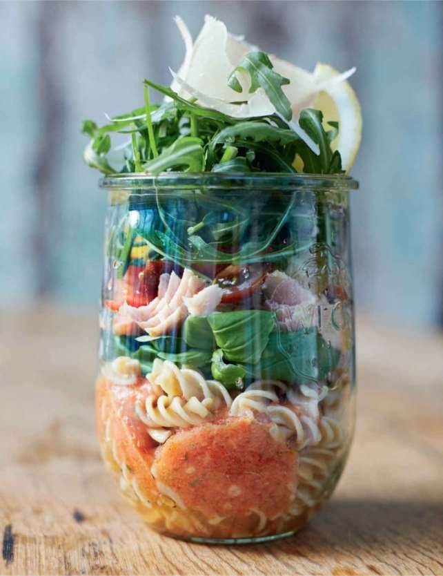 EVERYDAY SUPER FOODسالاد شیشه مربای ایتالیاییاین نهار خوش طعم و خوش رنگ باعث حسادت زیادی در محل کارتان می شود. با افزودن کربوهیدرات، پروتئین، سبزیجات و کمی لبنیات، شیشه های متعادلی درست کنید. پیش از سرو کردن، در یخچال نگه دارید و میکس کنید. زمانی که این دستور را کامل فرا گرفتید، از هر ترکیب فصلی که دوست دارید استفاده کنید، هر ماده غذایی باقیمانده در یخچالتان را که می خواهید به کار ببرید، و سبزیجات خریداری کرده تان را تمام کنید. سرو برای 1 نفر | 20 دقیقه طرز تهیه150 گرم پاستای غلات کامل پخته شده (75 گرم اگر از ابتدا پختن را شروع می کنید) را در انتهای یک ظرف شیشه ای 1 لیتری بریزید. 2 عدد گوجه فرنگی رسیده بزرگ را نصف کرده و دانه های آن را جدا کنید، سپس آن را به همراه ½ یک فلفل قرمز تازه، برگ های 1 شاخه ریحان تازه، آب ½ یک لیمو و 1 قاشق سوپ خوری روغن زیتون بکر ممتاز در مخلوط کن بریزید، سپس به مقدار دلخواه ادویه بزنید و با قاشق روی پاستا بریزید. بقیه ظرف شیشه ایتان را با 2 عدد گوجه فرنگی رسیده خرد شده دیگر، 2 مشت شابانک، 75 گرم ماهی تن کنسرو شده خشک شده، برگ 2 شاخه ریحان تازه دیگر و 15 گرم پنیر پارمسان رنده شده پر کنید. 1 برش لیمو روی آن بگذارید تا بعدا آب آن را بگیرید، سپس درب ظرف را ببندید.