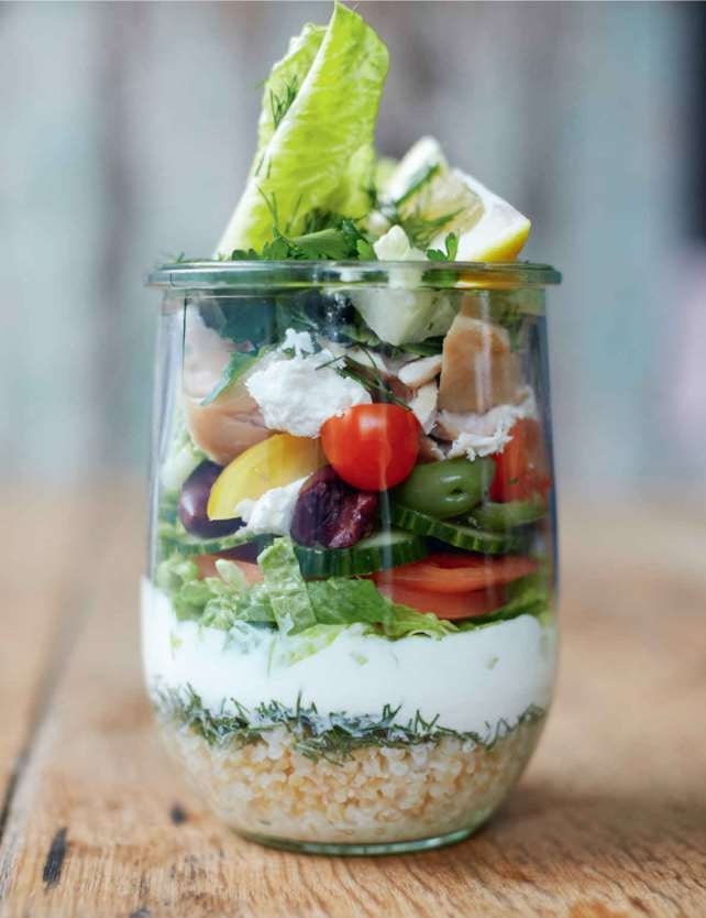 EVERYDAY SUPER FOODسالاد شیشه مربای یونانیاین نهار خوش طعم و خوش رنگ باعث حسادت زیادی در محل کارتان می شود. با افزودن کربوهیدرات، پروتئین، سبزیجات و کمی لبنیات، شیشه های متعادلی درست کنید. پیش از سرو کردن، در یخچال نگه دارید و میکس کنید. زمانی که این دستور را کامل فرا گرفتید، از هر ترکیب فصلی که دوست دارید استفاده کنید، هر ماده غذایی باقیمانده در یخچالتان را که می خواهید به کار ببرید، و سبزیجات خریداری کرده تان را تمام کنید سرو برای 1 نفر | 20 دقیقه طرز تهیه150 گرم بلغور گندم (75 گرم اگر از ابتدا می پزید) را در انتهای یک ظرف شیشه ای 1 لیتری بریزید، سپس برگ های 2 شاخه شوید تازه را ریز خرد کرده و روی آن بریزید. 2 قاشق سوپ خوری سرپر ماست طبیعی و 1 قاشق سوپ خوری روغن زیتون بکر ممتاز را با هم میکس کرده، سپس به مقدار دلخواه ادویه بزنید و با قاشق روی بلغور بریزید. بقیه ظرف شیشه ای تان را با ½ یک کاهوی نگینی کوچک خرد شده، 4 عدد زیتون (هسته گیری شده و چهار قسمت شده)، 1 عدد گوجه فرنگی رسیده خرد شده، 5 سانتی متر خیار خرد شده، 100 گرم مرغ پخته ریش ریش شده، برگ های ریز خرد شده 2 شاخه جعفری برگ صاف تازه، 15 گرم پنیر فتا و 1 قاشق چایخوری دانه کنجد بوداده پر کنید. 1 برش لیمو روی آن بگذارید تا بعدا آب آن را بگیرید، سپس درب ظرف را ببندید.