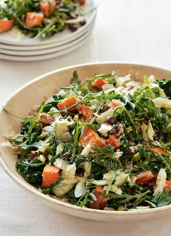 این نوع سالاد مخصوص من است – بسیار عالی و خوشمزه است و ترکیبی عالی از رنگها و طعمهای زمینی را دارد. علاوه بر این، به لطف پروتئین موجود در لوبیا و کینوا، شما را در کلِ بعدازظهر، سیر نگهمیدارد. این غذا گرم و لذیذ سرو میشود اما به همان اندازه سرد است، بنابراین میتوان آن را از قبل یا حتی شب قبل تهیه کرد.