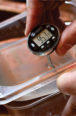 FLOUR WATER SALT YEASTاین بخشی از لذت پخت است. هر بار به محض اینکه خمیر مخلوط شد، دمای آن را یادداشت کرده و زمان آن را یادداشت کنید. همچنین زمان انجام هر یک از مراحل باقیمانده را یادداشت کرده و البته توجه داشته باشید که نان شما چگونه میشود. اگر گزارشی از دما و زمان تخمیر را برای مراجعات بعدی نگه دارید، میتوانید به طور روشمند فرآیند خود را برای رسیدن به نان عالی تنظیم کنید. شما همچنین از نانوایی بودن که کاملاً با کاری که انجام میدهید و چرا آن را انجام میدهید هماهنگ است، احساس رضایت میکنید. دستور العملهای این کتاب دمای آب مورد استفاده را مشخص میکند. من دماهای گرمتر را برای آب و خمیر نسبت به برخی نانواها به همراه مقدار کمتری مخمر ترجیح میدهم. مراقب باشید از آب خیلی گرم استفاده نکنید. مخمرهای تجاری در دماهای کمتر از 114 درجه فارنهایت (46 درجه سانتیگراد) از بین میروند. وقتی آرد را در دمای اتاق که معمولاً حدود 70 درجه فارنهایت (21 درجه سانتیگراد) است و آب در دمای 95 درجه فارنهایت (35 درجه سانتیگراد) مخلوط میکنم و اجازه میدهم مخلوط به مدت 30 دقیقه استراحت کند، پس از اتمام مخلوط کردن، خمیر به 78 درجه فارنهایت (26 درجه سانتیگراد) میرسد. این دمای مورد نظر من است. اگر تابستان است و اتاق گرمتر است (در این صورت احتمالاً آرد هم گرمتر است)، من از آب با دمای 90 درجه فارنهایت (32 درجه سانتیگراد) استفاده میکنم تا دمای خمیر مورد نظرم 78 درجه فارنهایت (26 درجه سانتیگراد) باشد. اگر آرد خود را در یخچال یا فریزر نگهداری میکنید، توصیه میکنم یک روز قبل از مخلوط کردن خمیر آن را بیرون بکشید. همه دستور العملهای این کتاب فرض میکنند که آرد در دمای اتاق است.