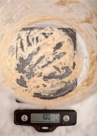 هنگامی که همه لواین را به جز ۵۰ گرم( ۳ قاشق غذاخوری) آن را در ظرف لواین اضافه کرده اید، می فهمید که مقدار زیادی لواین برای دور ریختن باقی نمانده است. مقدار زیادی نیست اما قدرت و پتانسیل بالایی دارد! هنگامی که همه لواین را به جز آن ۱۰۰گرم (⅓ پیمانه + ۱ و ½ قاشق سوپ خوری) دور ریختید،( فکر کنید که به جای سوخت مصرف شده استفاده شد)، ترازو را صفر کنید. ابتدا آرد سفید و سپس آب را اضافه کرده و با دست خوب هم بزنید و مخلوط کنید تا یکدست شود. یک نکته راجع به مخلوط کردن لواین با دست: محیط کشت کاملاً اسیدی است. اگر لازم است لواین را مرتب تغذیه کنید و پوست دستتان حساس است، باید از دستکش های یک بار مصرف وینیل برای مخلوط کردن کمک بگیرید. آنها را می توانید به راحتی در اطراف خود نگهداری کنید. من یک جعبه از آن برای مصارف مختلف در آشپزخانه دارم، مثلاْ برای مخلوط کردن دستیِ سالاد. بعد از اینکه از لواین برای پهت و پز استفاده کردید، باقی مانده آن را در سطح نگهداری کنید. صبح بعد وقتی طبق برنامه لواین را تغذیه می کنید، در واقع باقی مواد را تازه سازی می کنید.