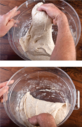 FLOUR WATER SALT YEASTبا این اوصاف، بی دلیل نیست که یک ساعت قبل از تقسیم و شکل دادن به خمیر بسیار سست، آخرین تا زدن خمیر را انجام بدهید. اگرچه دستور العمل های موجود در این کتاب، که پنج ساعت یا بیشتر زمان تخمیر دارند، انعطاف پذیری زیادی را در زمان اعمال چین ها ارائه می دهند، توصیه می کنم اولین چین را 10 دقیقه یا بیشتر پس از اتمام مخلوط نهایی اعمال کنید. هر چین متوالی می تواند در هر زمانی پس از اینکه خمیر به طور کامل از چین قبلی خلاص شد رخ دهد. خمیر به چند تا چین نیاز دارد؟ این بستگی به میزان مرطوب و شل بودن آن هنگام مخلوط کردن دارد. خمیرهای مرطوب در طول مخلوط کردن با دست، گلوتن بسیار کمی پیدا میکنند، بنابراین در طی یکی دو ساعت اول تخمیر به سه یا چهار برابر زمان نیاز دارند تا به شبکه گلوتن کافی برای ایجاد بافت خردهای سبک در نان برسد. دستور العمل های موجود در این کتاب هر کدام راهنمایی هایی در مورد زمان بندی و تعداد چین های توصیه شده ارائه می دهند و معمولاً محدوده ای مانند سه تا چهار برابر را مشخص می کنند. با این حال، من نمی خواهم بیش از حد سخت و سریع با قوانین مربوط به این موضوع برخورد کنم. هنگامی که با خمیر خود، کار می کنید، پس از تا کردن خمیر، می توانید تغییرات فیزیکی را مشاهده کنید. اگر بر اساس آنچه مشاهده می کنید، می خواهید یک بار دیگر به آن بپردازید، این کار را ادامه دهید.