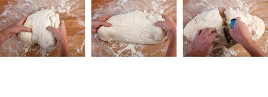 FLOUR WATER SALT YEASTمرحله 4) خمیر را تقسیم کنیدوقتی خمیر دو یا سه برابر شد (هر کدام در دستور مشخصشده است)، زمان تقسیم آن است. یکی از دلایلی که کاسه های Cambro کامبروی شفاف برای تهیه نان را بسیار مفید می کند این است که این امکان را به شما میدهد تا بهسرعت مشخص کنید که تخمیر اولیه (bulk fermentation) به پایان رسیده است. مثلاً، اگر اندازه خمیرقبل تخمیر 1لیتر باشد در طولِ تخمیراولیه، سه برابر شود و تقریباً به خط 4 لیتر برسد. این مرحله تنها چند دقیقه طول میکشد که چند بار آن را انجام دادهاید اما ممکن است در ابتدا کمی بیشتر طول بکشد. سطح کار را کمی آردپاشی کنید. شما به مساحتی در حدود 2 فوت نیاز دارید. در کنار ناحیه آرد پاشی شده، دستان خود را آرد پاشی کنید و خمیر را بهآرامی از اطراف کاسه جدا کنید و مراقب باشید که رشتههای گلوتن پاره نشوند. (در این مرحله گلوتن نسبت به زمانی که خمیر برای اولین بار مخلوط شد ظریفتر است.) سپس به ته کاسه برسید و بهآرامی کف خمیر را از کاسه جدا کنید. خوبه که مقداری آرد را در کنار لبهها بریزید تا زیر خمیر کار کرده و پخش آن را آسان کند. سپس کاسه را به طرف آن بچرخانید و با دستان خود بهآرامی خمیر را به سطح کار برسانید. در وسط بالای خمیر، جایی که آن را برش میزنید، آرد بپاشید