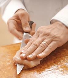 Mastering Knife Skillsروش کف دست بر روی مادهاز این پوزیشن برای بریدن نان بیگل و لقمه ها، تکه های پروانه ای گوشت، و آخرین برش های میوه ها و سبزیجات بزرگ و گرد استفاده می شود.