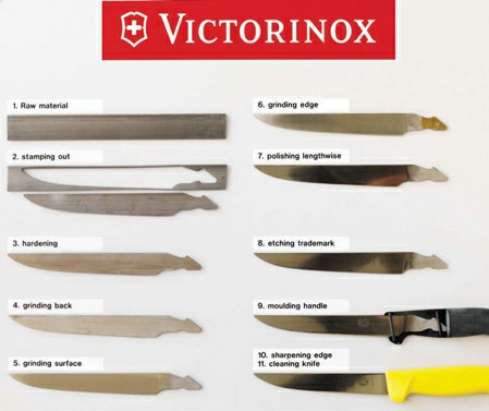 عکس بالا نشان دهنده فرایند استفاده شده برای تولید یک چاقو، در این مورد یک چاقوی استخوان بر، با روش مهرزنی می باشد. همه چاقوها دارای زبانه کامل یا بالشتک نیستند – این اجزا را فقط بعضی از کارخانه ها درست می کنند. همانطوری که در شکل می بینید، پس از اینکه فلشینگ برداشته شود (دومین عکس از بالا سمت چپ)، این چاقوی استخوان بری هیچ کدامشان را ندارد، اما توسط یک کارخانه با کیفیت بالا ساخته شده است، و البته این امر برای بسیاری از کارخانه ها درست است. این چاقوها معمولا کیفیت کلی بالاتری دارند، اما برای برخی از کاربردها مانند استخوان بری و فیله بری، استفاده از یک چاقوی تولید شده با روش مهرزنی کفایت می کند. علی رغم تمامی برتری هایش در زمینه مواد اولیه و فرایند، ساختار اصلی چاقو اندکی تغییر کرده است. این چاقو هنوز یک تیغه تک لبه ای و یک دسته و نوعی بالشتک در وسط تیغه دارد. دسته چاقو، که در ابتدا از چوب یا بعضی اوقات از شاخ حیوانات درست می شد، هم اکنون از پلاستیک یا سایر مواد کامپوزیتی درست می شود، اما طراحی اصلی آن در طی زمان تغییر نکرده است. |