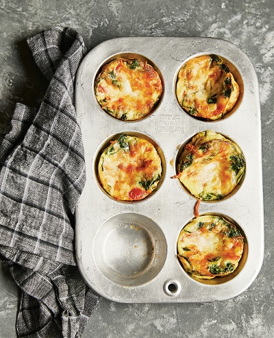 پیش از اضافه کردن مخلوط تخممرغ، 1 قاشق سوپخوری اسفناج تازه و خرد شده و 1 قطعه گوجه گیلاسی (که به چهار قسمت تقسیم شده) یا انگور را در هر قالب مافین بریزید. سپس، مخلوط تخممرغ را اضافه کنید، و روی هر پیمانه ½1 قاشق چایخوری پنیر چدار رنده شده اضافه کنید و مخلوط را طبق دستور بپزید.