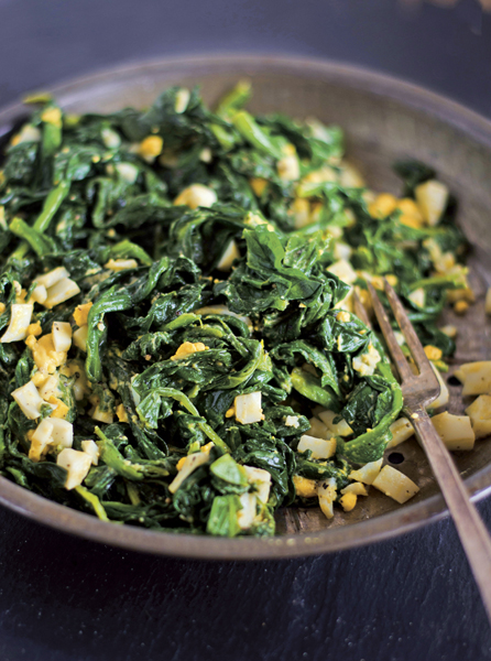 - اسفناج پژمرده را در آبکش بریزید و فشار دهید تا مایع اضافی آن خارج شود. قابلمه را برگردانید و کره را اضافه کنید و روی حرارت ملایم آب کنید. داخل اسفناج بریزید. نمک، فلفل سفید و تخممرغ ریز شده را با هم مخلوط کرده و سرو کنید.