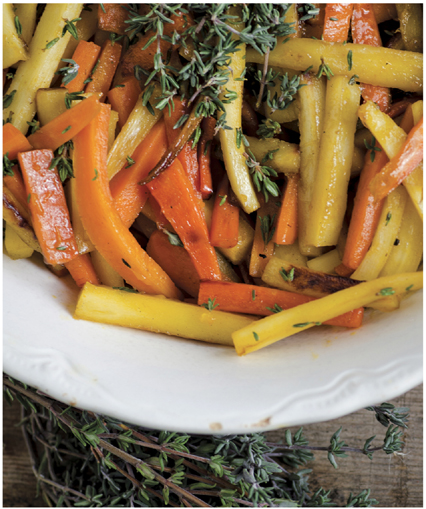 - سیروپ افرا و آب پرتقال را هم بزنید و حدود 2 دقیقه به پخت ادامه دهید تا مایع تبخیر شود. حرارت را خاموش کنید، آویشن را روی سبزیجات بپاشید و با نمک مزهدار کنید. یک بار دیگر هم بزنید، سپس سرو کنید.