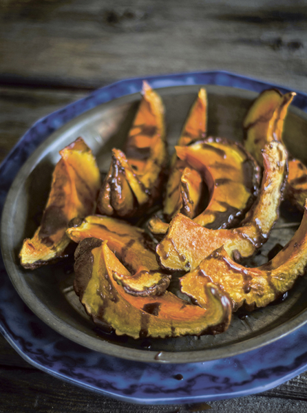 - کدو تنبل را خوب بشویید تا هرگونه آلودگی چسبیده به پوست آن پاک شود، سپس آن را از وسط نصف کنید و دانهها را از گوشت آن بتراشید، کمپوست کنید یا دانهها را دور بریزید. کدو تنبل را بهصورت هلالهای نازک بهضخامت حدود ½ اینچ برش دهید و در یک لایه روی سینی فر بچینید. کرۀ آب شده را بریزید و نمک بپاشید. بهمدت 30 تا 35 دقیقه تفت دهید تا گوشت نرم شود و لبههای برشها فقط با یک لمس کاراملی شوند.